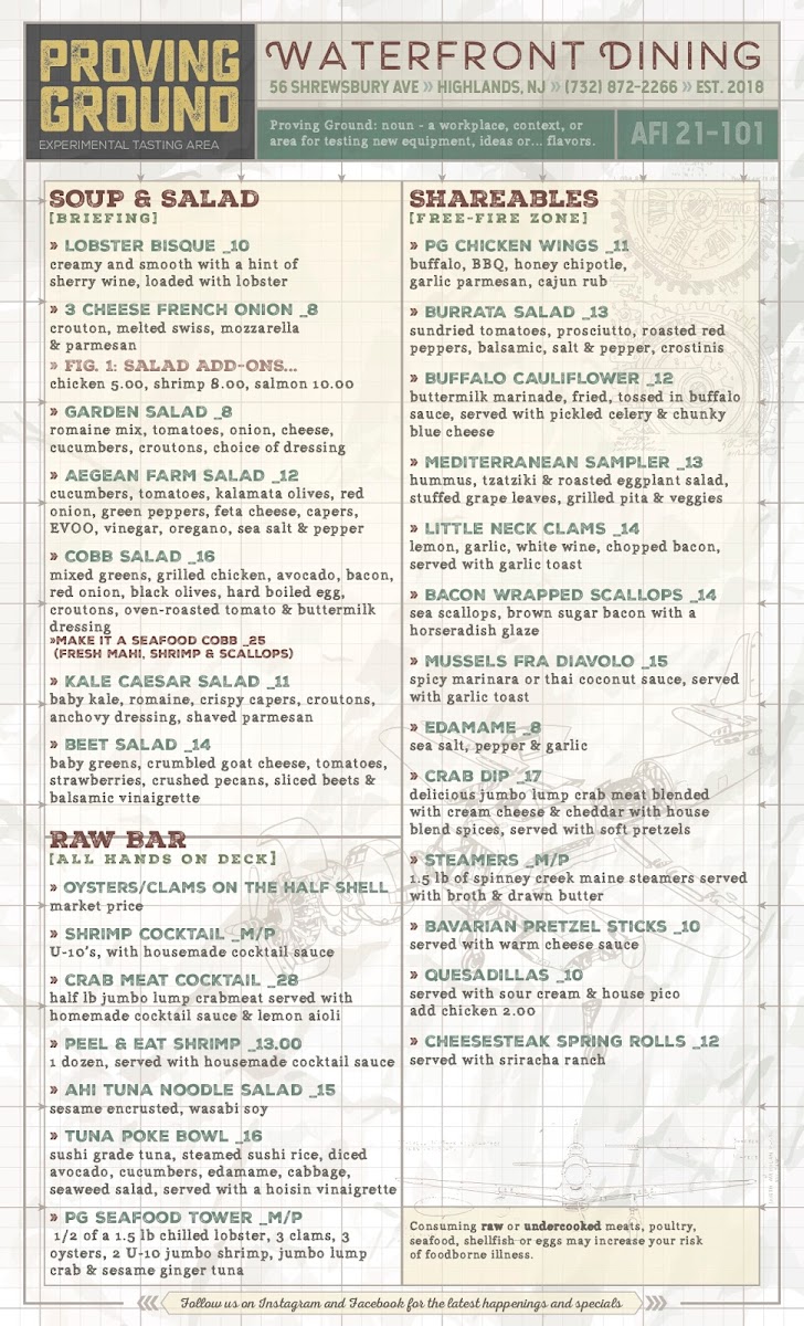 The menu at Proving Ground Waterfront Dining offers a thoughtful blend of casual coastal fare and comforting main courses, ideal for a relaxed meal by the water. Whether you're stopping by for light bites or a more substantial dinner, the selection balances fresh seafood with hearty options, all served in a setting that invites easy conversation and a laid-back vibe.